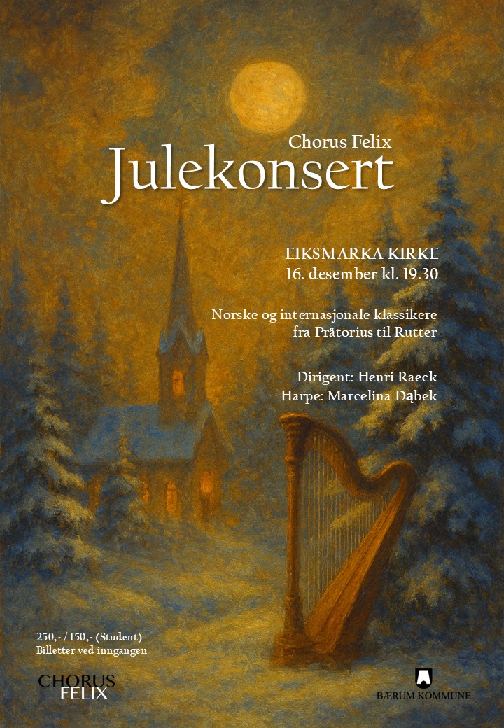 Julekonserten med Chorus Felix er tirsdag 16. desember 2025 i Eiksmarka kirke.